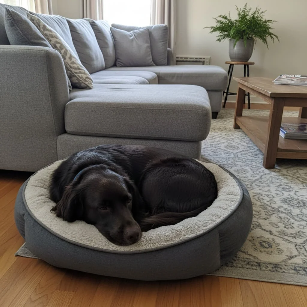 Create a comfy area where your dog is safe. Adding familiar bedding, toys, and comforting smells. But some dogs do well with background noise — calming music, the radio.